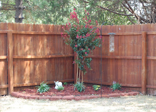 Since I couldn’t drive to my backyard to try and pull it out with my Escape, I basically had to dig around this tree and slowly work my way underneath it. It was quite an adventure. Once I got it out — probably a little more than an hour’s work — the rest felt simple. You can see with the before and after pictures that there are a few new flowers around the replacement tree — a crepe myrtle — to spruce things up a bit. Now comes the fun part of keeping it all alive.