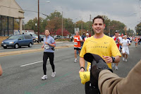 The next few miles were nice because I was in familiar territory running by VCU and my office. As I hit mile 19, I could tell I was slowing, but everything seemed to be in check. (Mile 17-19 were 9:37, 9:46, 9:49.) My feet were hurting just a bit, but nothing major. And just before mile 20 was a hill — I dreaded that hill. It was at this point I began to see people stopping to stretch, or just flat out walk up the hill. I had come that far that I was not going to walk until the next water stop. I hit mile 20 in 10:30, then slowly walked through the water stop. Even though I had gotten lots of water or Powerade at every stop, and I was feeling great as far as thirst went, I took this water stop for all it was worth. Two cups of water and a cup of Powerade to go, please. I walked about another 100 yards taking every drop of fluid in those cups. About 10 other people were doing the same thing. And this is the point that everybody talks about — after mile 20.